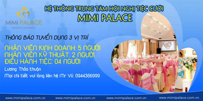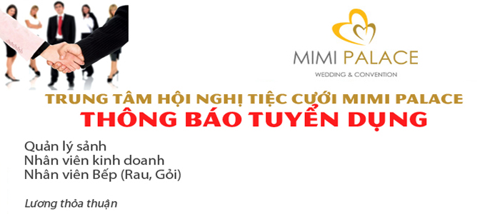 MIMI PALACE - BÌNH DƯƠNG cùng chi nhánh DƯƠNG GIA PALACE đang cần tuyển đội ngũ nhân viên sau: - Vị trí sales: 05 người - Vị trí Điều hành tiệc: 04 người - Nhân viên kỹ thuật: 02 người